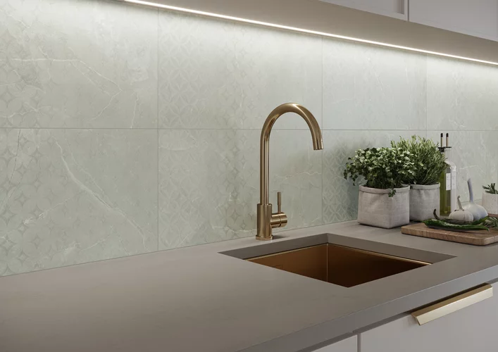 Complementing the collection are decorative wall tiles in a 29.8x59.8 mm format in Grey. They possess a spectacular effect of shimmering patterns, which are also tangible to the touch.