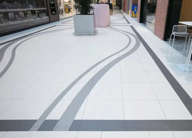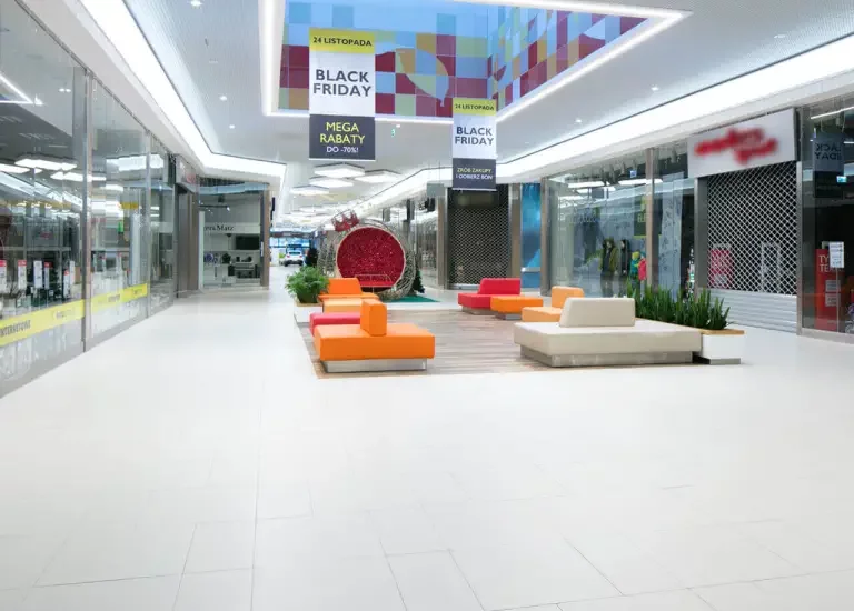 Okładziny ceramiczne to sprawdzone rozwiązanie w galeriach handlowych. Są trwałe, stabilne wymiarowo, odporne na uszkodzenia mechaniczne, promieniowanie UV i chemiczne środki czyszczące. Dobrej jakości i dobrze położone płytki ceramiczne nie sprawiają problemów użytkowych i pielęgnacyjnych.