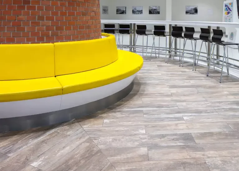 W kameralnych, z założenia mniej intensywnie użytkowanych miejscach galerii handlowych, takich jak np. klimatyczne restauracje, niszowe salony wystawowe lub przestrzenie relaksu, projektanci mogą zastosować terakotę odwzorowującą wygląd naturalnego drewna. Taka drewnopodobna posadzka wprowadza element przytulności i ciepła, niwelując przytłaczającą anonimowość i masowość galerii handlowej.