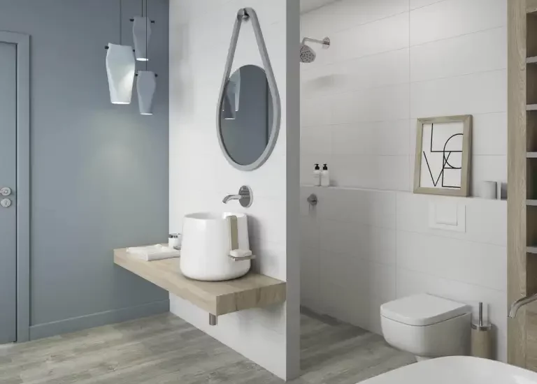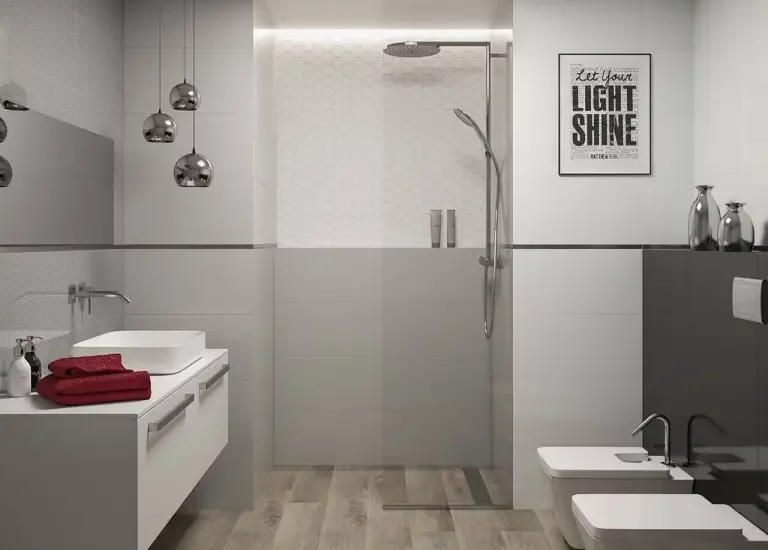 Biel plus szarość to zestawienie nie tylko modne, ale i praktyczne. Jest jednym z najbardziej neutralnych połączeń, dzięki którym goście nie będą czuć się przytłoczeni nadmiarem „hałaśliwych” barw. W zależności od użytej ceramiki sanitarnej i dodatków, dzięki bieli i szarości można stworzyć wnętrza w różnych stylach.