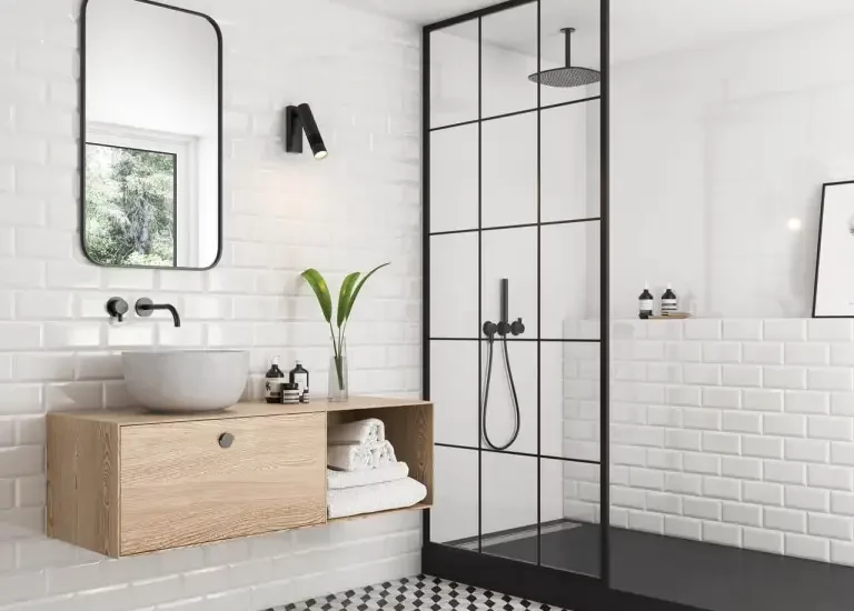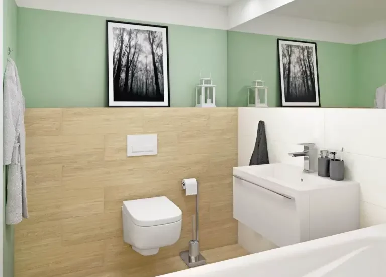 Wprowadź do łazienki lekkie elementy kontrastowe w ciemniejszych barwach.