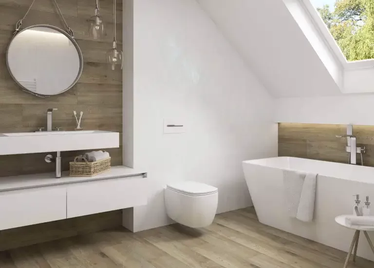 Jeśli projektujesz łazienkę z oknem połaciowym, wlewającym do łazienki masę słonecznego światła, zadanie jest dużo łatwiejsze – rozświetlenie sprawia, że wnętrze wydaje się o wiele większe. Warto podkreślić ten rozjaśniający efekt jasną ceramiką – biała glazura i płytki do złudzenia przypominające naturalne drewno, doskonale spełnią to zadanie.