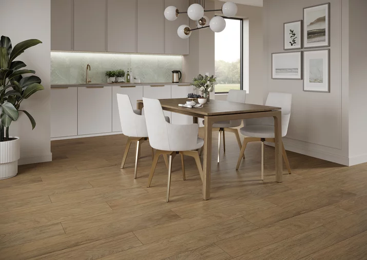 Die Kollektion umfasst ein rektifiziertes Format 198 x 1198 mm mit einer matten Oberfläche und einer dezenten, universellen Struktur, die sich auf den Charakter von Holz bezieht.