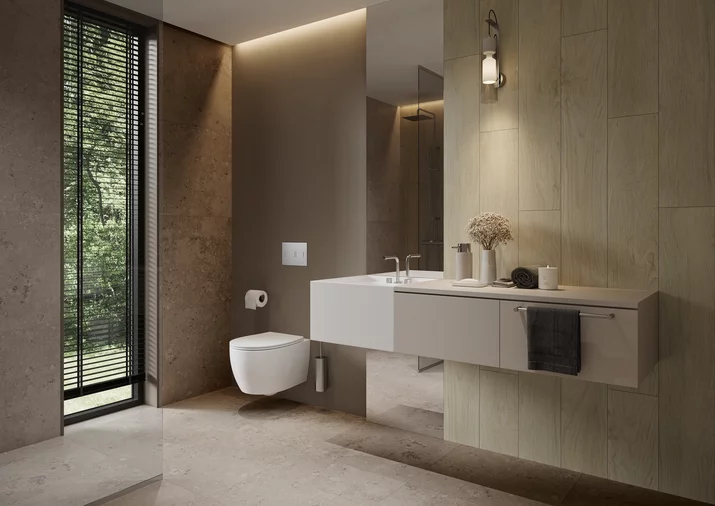 Warmwood has wide, noble, softly transitioning grains along the wood structure. This design of the highest-quality selected raw material in warm colours of Crema, Gold, and Chocolate, combines elegance with natural aesthetics. The stylish aspect of wood will perfectly fit into projects even of the highest standard, harmonising well with various trends. Pairing this noble collection with tiles like calacatta marble or travertine ensures an elegant and timeless look for any space.