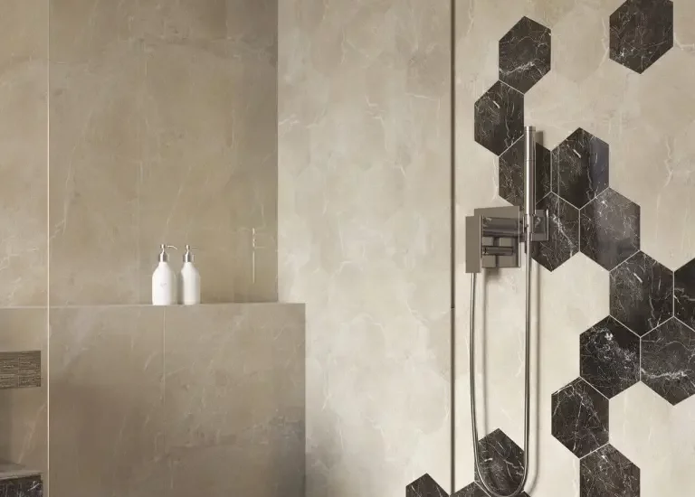 Kolekcja Rockstone z powodzeniem może ozdobić każdą łazienkę – strukturalne płytki podłogowe mają certyfikat „Bosa Stopa”, i występują w kilku atrakcyjnych wersjach – m.in. modnych heksagonów.