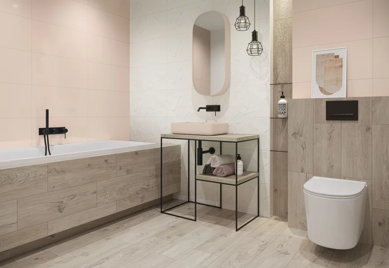 Zainspiruj się pastelowymi kolorami i stwórz niebanalną łazienkę. Dodatki z pudrowego różu, beżu lub kremowej bieli to świetny pomysł na ciekawą aranżację. Przytulne miejsce do kąpieli i codziennej kosmetyki to podstawa każdego domu. Ceramiczne płytki w pastelowych barwach wprowadzają do pomieszczenia przytulności i eleganckiego charakteru.