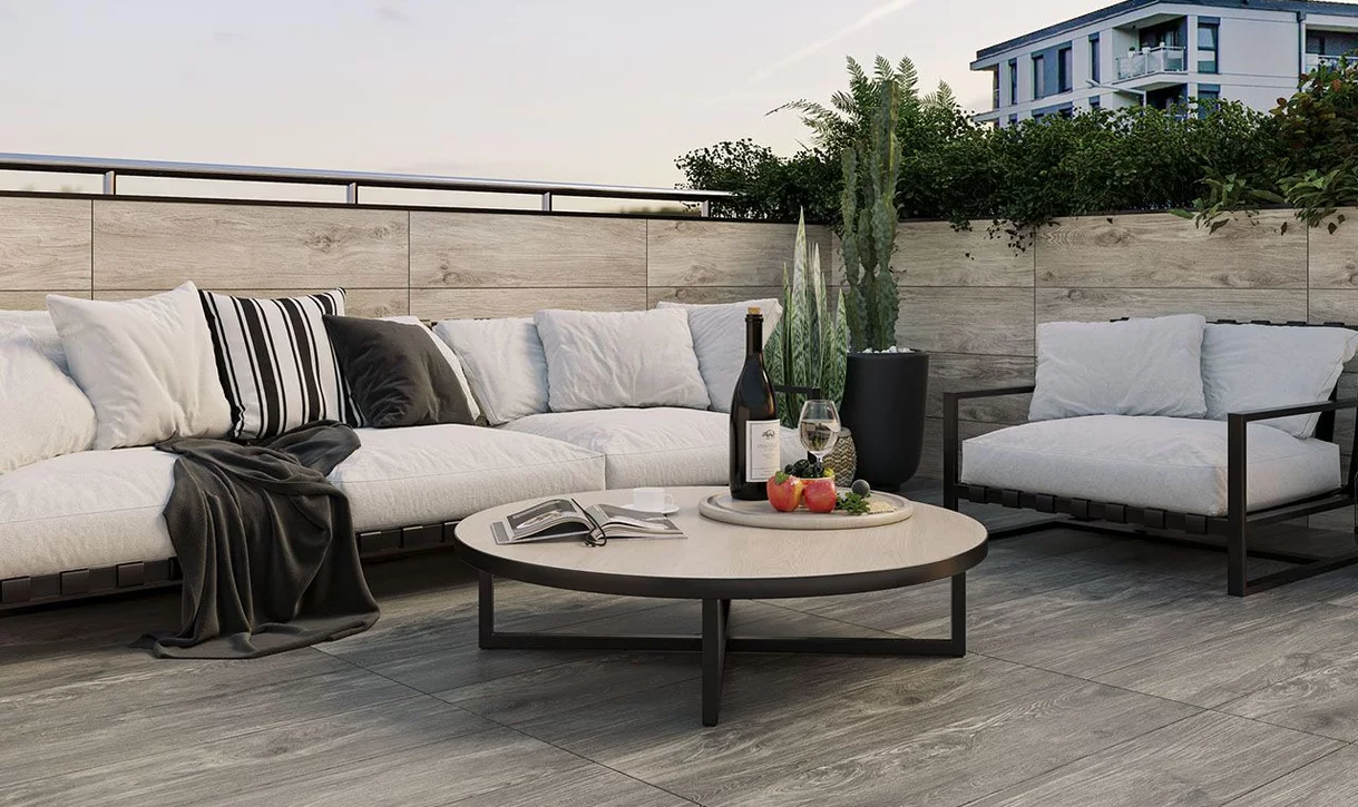 Aranżacja tarasu lub dużego balkonu z wykorzystaniem doskonale odzwierciedlających naturalne drewno płyt tarasowych Sherwood. Płyty dzięki swojej dwucentymetrowej grubości można układać na podłodze tradycyjnie lub w technologii tarasu wentylowanego. Całość ozdabia osłona na rośliny, która również została wykonana z płyt Sherwood. Dzięki temu nie ma dodatkowych podziałów kolorystycznych między poszczególnymi płaszczyznami. Dzięki prostym środkom jak zastosowanie czarnych ram mebli w połączeniu z naturalnymi tkaninami udało się uzyskać przytulną zewnętrzną strefę relaksu.
