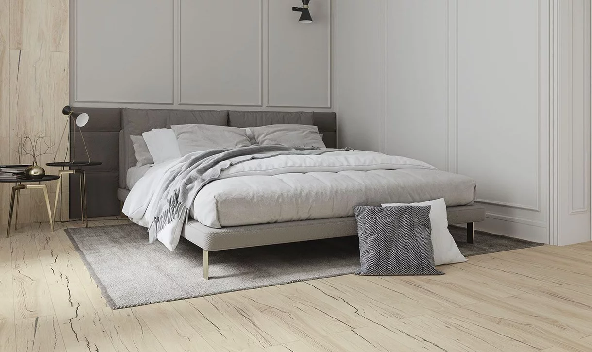 Drewno i jasna szarość to doskonałe połączenie w sypialni – ułatwia wieczorne wyciszenie i sprzyja spokojnym porankom. Duże ceramiczne deski Craftland zdobią zarówno podłogę, jak i ścianę oryginalnej sypialni, w której zastosowano również lekkie sztukaterie. Aranżację uzupełniają nowoczesne lampy oraz jasnoszare tekstylia na dużym kontynentalnym łożu.