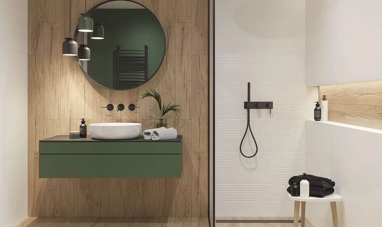 Bazą aranżacji nowoczesnej łazienki z kabiną walk-in są drewnopodobne płytki Craftland odwzorowujące surowe piękno spękanych desek w ciepłym odcieniu beżu. Tworzą one wyważony, harmonijny duet w połączeniu z białymi płytkami (strukturalnymi i gładkimi). Wisząca szafka umywalkowa w kolorze ciemnej szałwii podkreśla naturalny charakter łazienki.