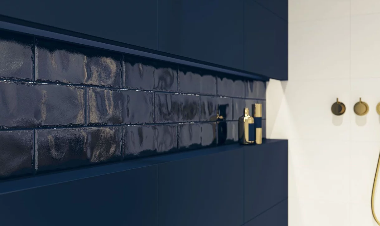 Jak w ciekawy sposób wyróżnić wnękę w ścianie pod prysznicem? Ceramiczna cegiełka kolekcji Porcelano, to świetny wybór nie tylko do stref mokrych. Błyszcząca powierzchnia Porcelano Ondulato - nawiązująca kształtem i formatem do ręcznie robionych płytek struktura oraz ciemnoniebieski kolor uzupełniający płytki bazowe - poprzez dodatkowe wybłyszczenie nie tylko optycznie powiększy nam głębokość wnęki, ale położona naprzemiennie jest jednym z najpopularniejszych trendów wnętrzarskich ostatnich lat