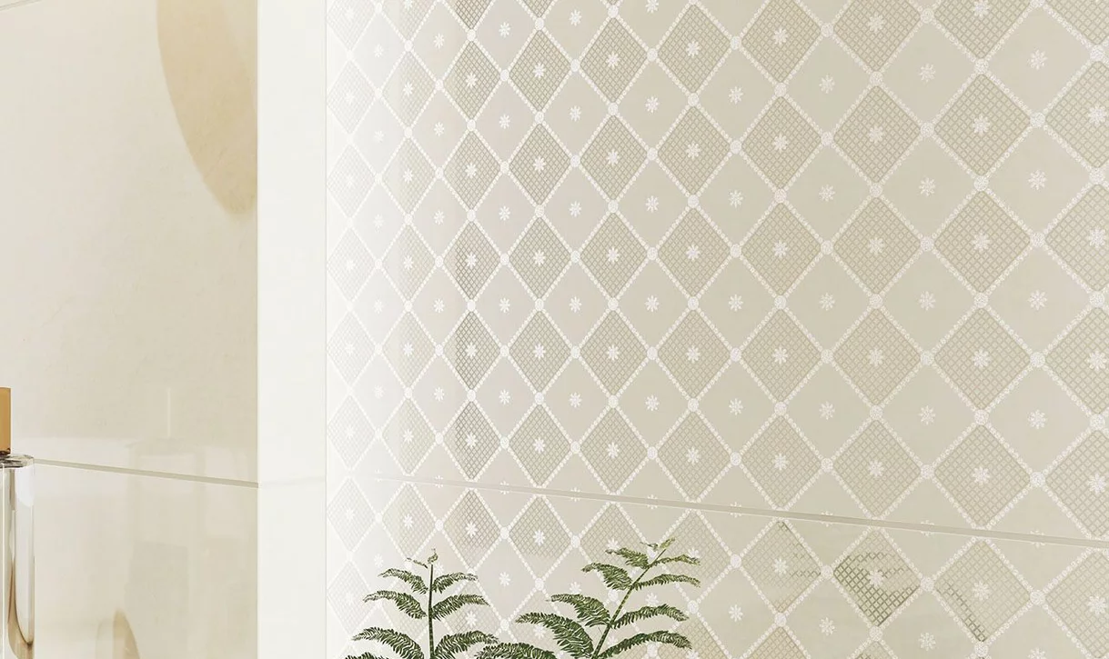 Klasyczny wzór oraz gra światła podkreślająca subtelną kratkę w kremowych insertach dekoracyjnych kolekcji Palazzo pozwolą na ciekawe zaaranżowanie każdej łazienki. Doskonale sprawdzą się na większej powierzchni jak też jako akcent w formie pasa między płytkami bazowymi w tym samym kolorze kremowego beżu.