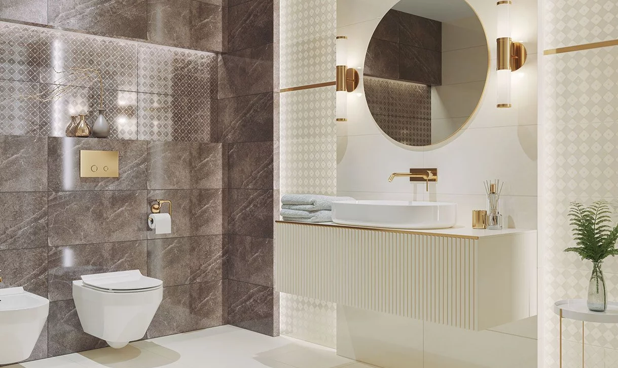 Błyszczące ceramiczne inserto kolekcji Palazzo doskonale współgra z grafiką marmuru. Dodatkowo łazienkę utrzymaną w kremowej tonacji świetnie uzupełnią złote elementy wyposażenia wnętrza. Takie połączenie kolorów i błyszczącej powierzchni płytek ceramicznych nie tylko sprawią, że poczujesz odrobinę luksusu w swojej łazience, ale też pozwoli ją optycznie powiększyć.