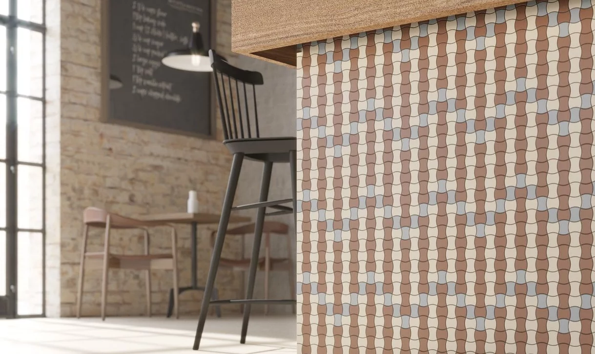 W klimatycznej kafejce w dominującym nowoczesnym stylu, projektant postawił na oryginalne przełamanie nowoczesnych środków aranżacyjnych elegancją modernizmu. Dlatego efektowne, drobne "gorseciki", ułożone w regularne wzory w kolorach czekolady, beżu i błękitu, kontrastują tu efektownie z surowością ceglanej ściany i jasnej ceramicznej posadzki. Metalowe czarne lampy, drewniane meble i tablice do pisania współtworzą spójną stylistycznie całość.