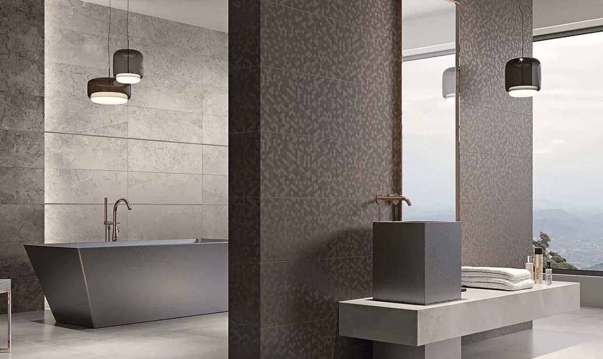Obszerna, dwuczęściowa łazienka z ogromnym oknem, została urządzona w eleganckich barwach ziemi. Płytki ścienne o wyglądzie skał w odcieniach beżu i brązu, są naturalnym tłem dla ścianki działowej, ozdobionej metalizowanymi płytkami w ciemniejszym odcieniu. Jasna posadzka z wielkoformatowych płyt ceramicznych optycznie powiększa i tak dużą przestrzeń. Mocne bryły ceramiki sanitarnej podkreślają prestiż miejsca.