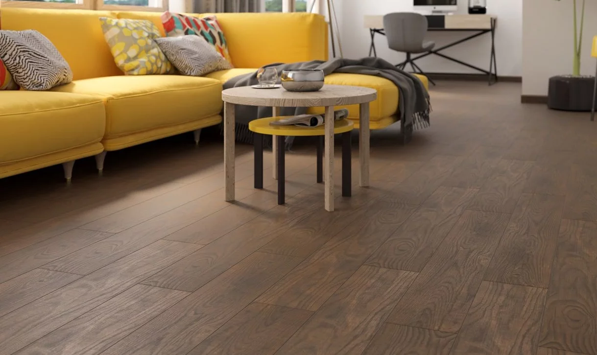 Połączenie przestrzeni salonu i domowego biura może być bardzo funkcjonalne, a jednocześnie przyjemne dla oka, gdy bazą jest jednorodna podłoga o wyglądzie ciemnego, naturalnego drewna o widocznym, zróżnicowanym usłojeniu. Słoneczne światło z dużych przeszkleń podkreśla walory wnętrza, uwypuklając wysoką jakość zastosowanych materiałów. Żółta sofa narożna, miękkie tekstylia i żywe rośliny, dodają salonowi przytulności.