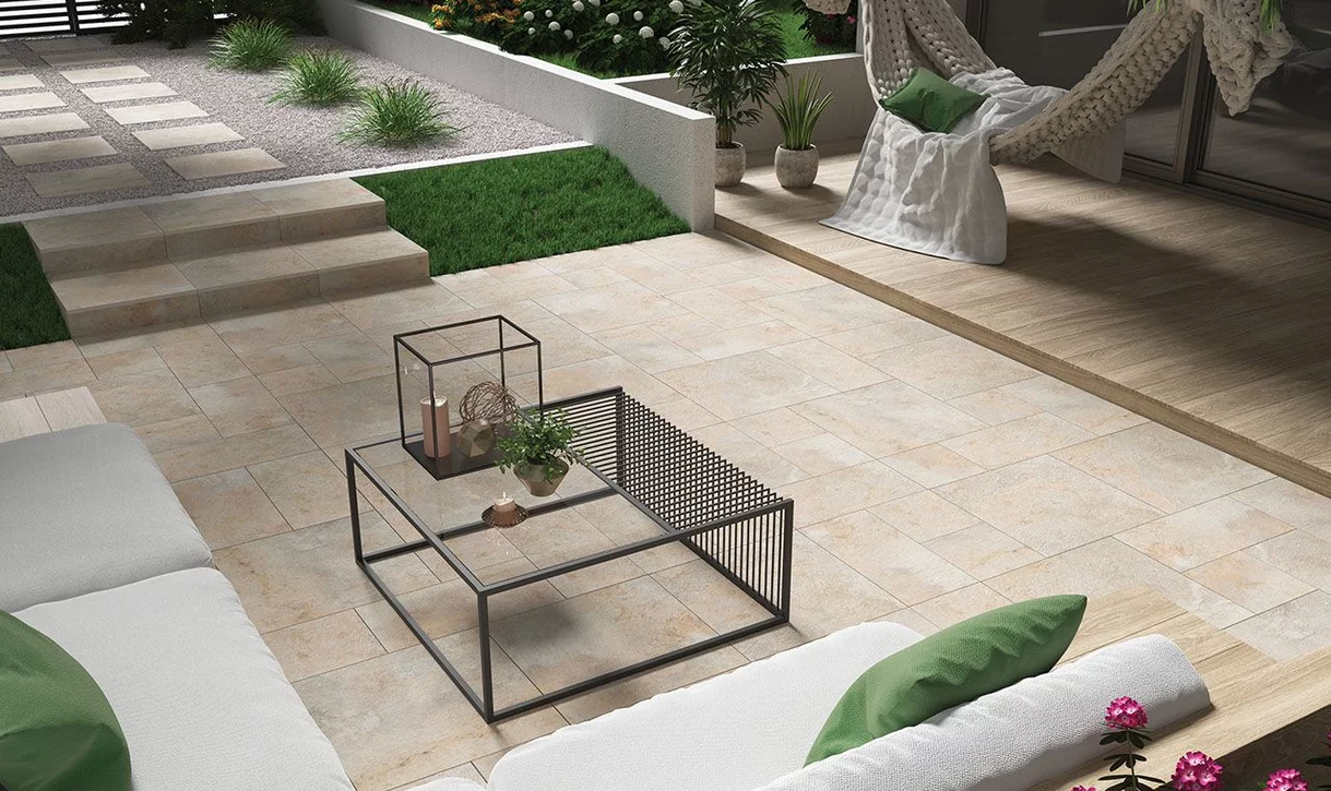 W ekskluzywnej ogrodowej strefie relaksu wykorzystano grube płyty tarasowe Burlington w jasnobeżowym odcieniu. - Ich trwałość, odporność na warunki klimatyczne i uszkodzenia mechaniczne gwarantuje bezproblemowe użytkowanie przez długie lata. Gustowne połączenie kwadratowych płyt z ceramicznymi deskami pod hamakiem i jasnymi meblami ogrodowymi sprawia, że całość jest pełna światła i przyjemna dla oka.