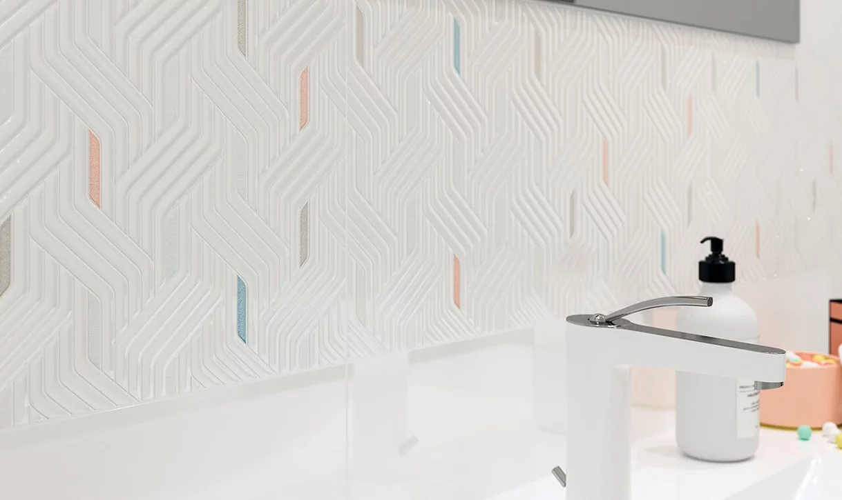 Zbliżenie na dekoracyjny pas nad umywalką w łazience pokazuje, jak dyskretnymi środkami można uzyskać ciekawy efekt. Strukturalne białe płytki o zgeometryzowanej formie ozdobione są barwnymi, pastelowymi pionowymi wstawkami. Dzięki nim do jasnej łazienki wkracza nienachalny świat barw, ożywiając wnętrze. Pastelowy róż, błękit i pudrowa szarość idealnie ze sobą współgrają.