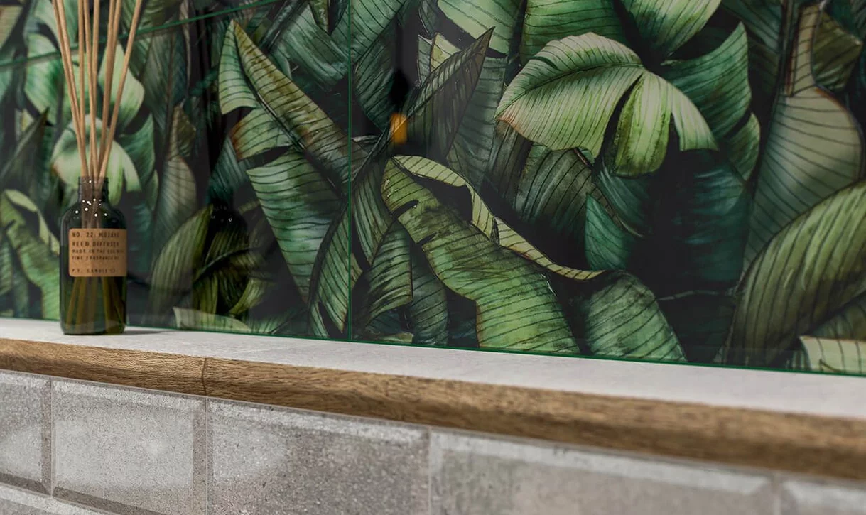 Uwielbiasz barwy ziemi, styl eko i żywą zieleń roślin? Możesz je zgrabnie połączyć nawet w małej, miejskiej łazience. Wprowadź do wnętrza subtelne szarości (w postaci gładkich i cegiełkowych płytek ceramicznych), drewnopodobne płytki na podłogę oraz mocne w wyrazie dekoracje szklane z motywem egzotycznych liści bananowca. Pamiętaj też o czarnych metalowych akcentach - np. czarnej baterii umywalkowej, lampie i blacie. Całość będzie nie tylko praktyczna, a również bardzo atrakcyjna wizualnie.