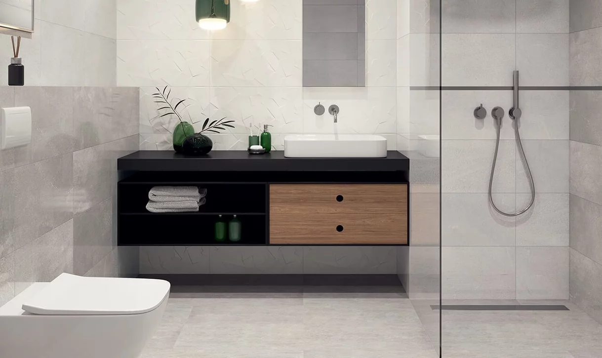 W przestronnej łazience w nowoczesnym apartamentowcu postawiono na ponadczasowe, zawsze eleganckie i efektowne połączenie ze sobą różnych odcieni szarości. Umiejętne zestawienie jaśniejszych i ciemniejszych płytek ceramicznych oraz odpowiednie oświetlenie pomieszczenia nadało mu oryginalną formę. Kolorystyka wnętrza przełamana została podwieszaną szafką pod blatową z elementami naturalnego drewna i lakierowanej czarnej płyty oraz dekoracyjnymi dodatkami w kolorze butelkowej zieleni.