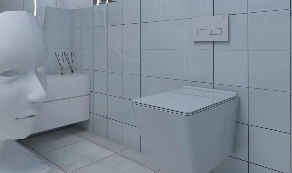 Białe płytki na ścianie i podłodze w łazience to pomysł, by dodać wnętrzu przestronności. Glazura w kształcie niewielkich kwadratów na ścianie i większych na podłodze plus białe meble, umywalka i muszla WC w kształcie sześcianów, okrągłe lustra i niecodzienne oświetlenie sprawiają, że łazienka wygląda niczym z ze świata gier komputerowych.