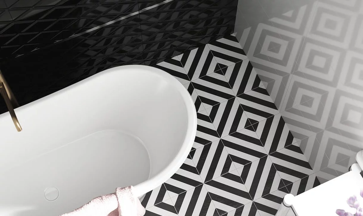 Błyszczące, strukturalne płytki ścienne z motywem kratki, wolno stojąca wanna na ozdobnych nóżkach i elegancka biała podłoga z czarnymi kwadracikami – to zestawienie, które może się podobać zarówno zwolennikom stylu klasycznego, jak i nowatorom, poszukującym nowoczesnych środków wyrazu.