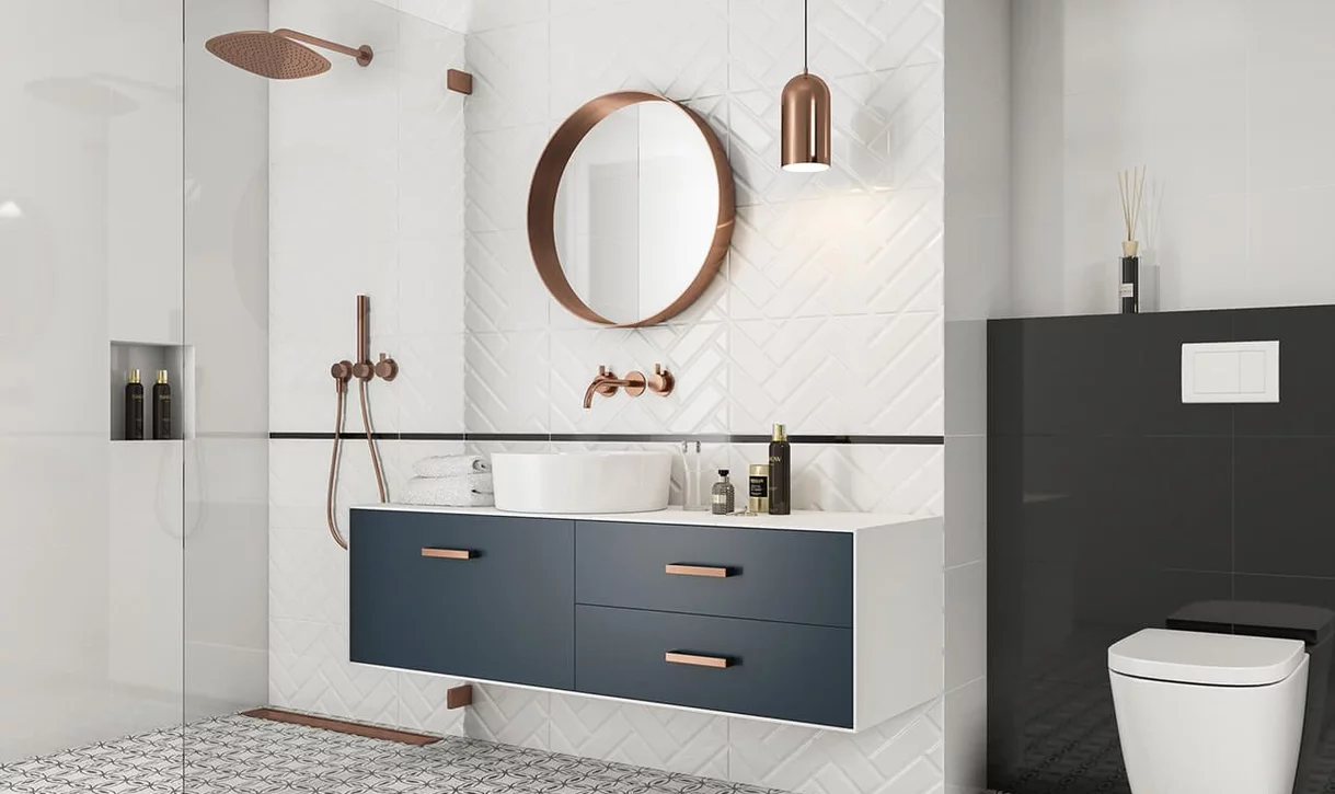 Ceramiczne, białe cegiełki w ukośnym układzie, zestawione na ścianach z białymi i czarnymi błyszczącymi płytkami oraz wzorzystą podłogą, tworzą przestrzeń pełną blasku i lekkości. Nowoczesna szafka z umywalką nablatową i elementy wyposażenia w kolorze miedzi, uzupełniają ten efekt.
