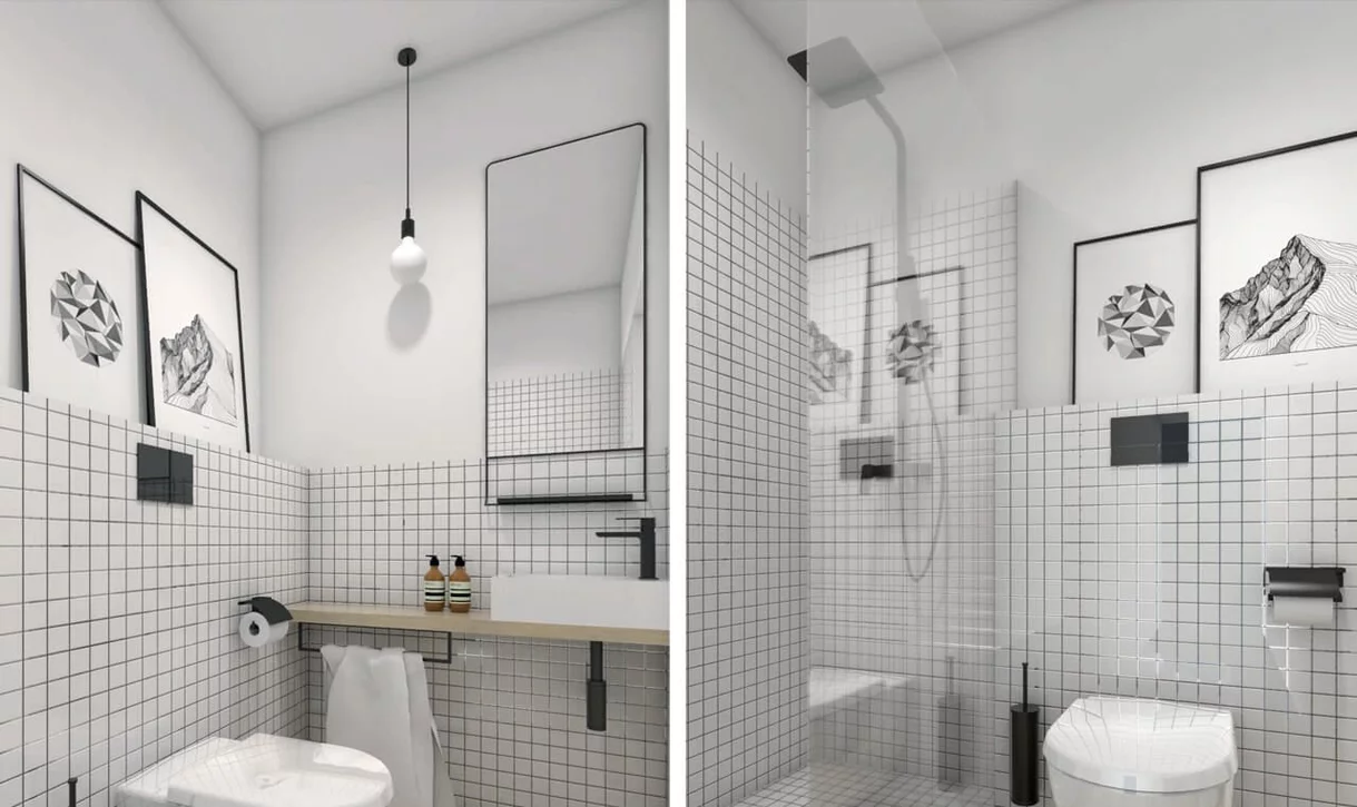 W niewielkiej przestrzeni świetnie prezentuje się biała mozaika z kolekcji Albir podkreślona grafitową fugą. Na posadzce drewnopodobne płytki z kolekcji Wood Rustic ocieplają wnętrze. Czarne elementy - baterie, lustro, oprawka, przycisk spłukujący... - dodają wnętrzu wyrazistości.