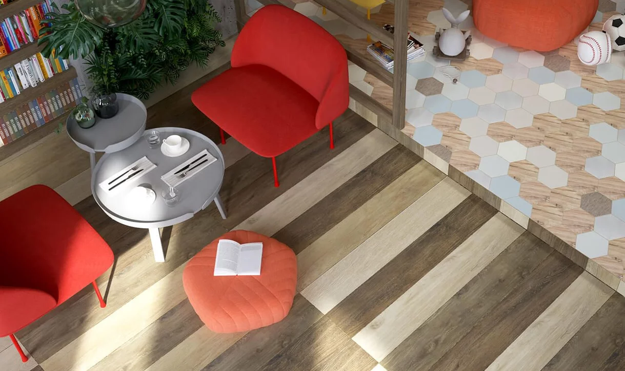Projekt nowoczesnej kawiarni oparty na elementach drewnianych i żywych kolorach podkreślających charakter wnętrza. Płytki drewniane z kolekcji Roble idealnie pasują do zielonych barw roślinności. To połączenie dodaje klasy każdej aranżacji, naturalne materiały są aktualnie w czołówce trendów światowych, a w tym przypadku roślinność wpłynie na miło spędzony czas w kawiarni. Na podwyższeniu znajduje się kącik dla matek z dziećmi, które mogą spędzić tam wspólnie czas. Jest to kolorystycznie wyodrębniona przestrzeń, do której stworzenia idealnie pasowały płytki z kolekcji Esagon.