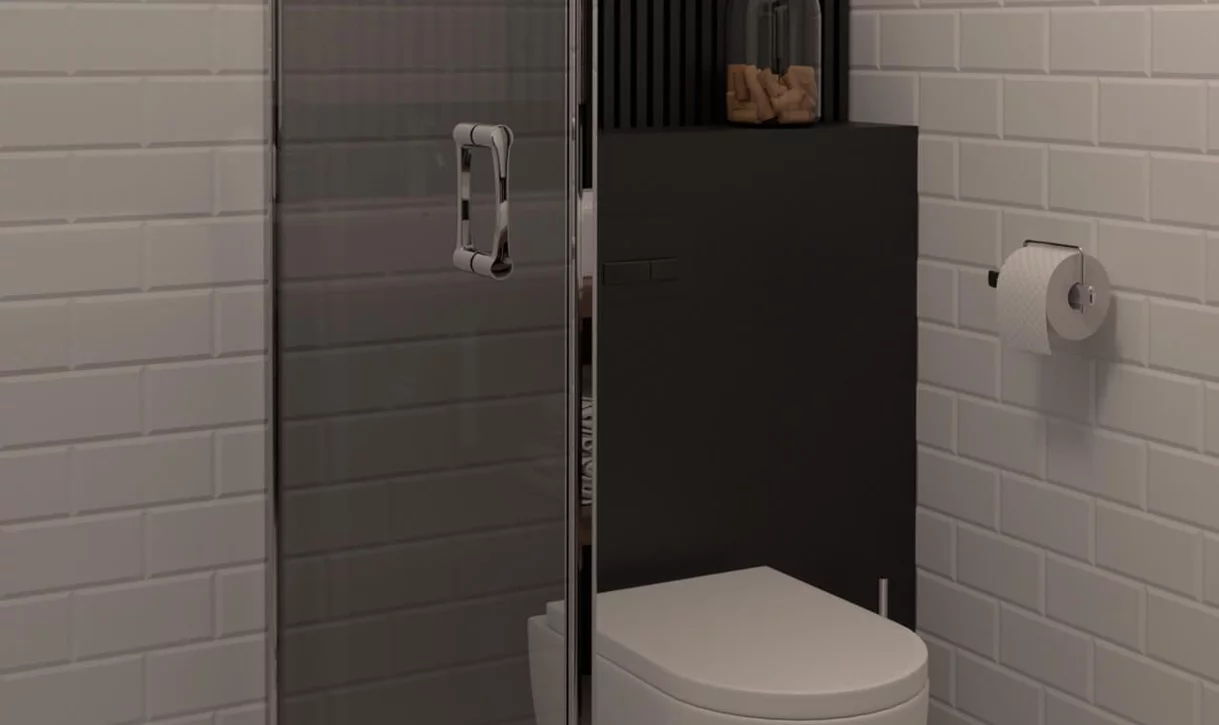 Projekt małej łazienki w ponadczasowej tonacji bieli i czerni. Dzięki połączeniu czarnych pionowych paneli z białymi płytkami w kształcie cegieł pomieszczenie nabiera loftowego charakteru. Dopełnieniem, jak i przełamaniem całego wnętrza jest szara posadzka, która w połączeniu z drewnianym blatem ożywia dość monochromatyczne wnętrze.