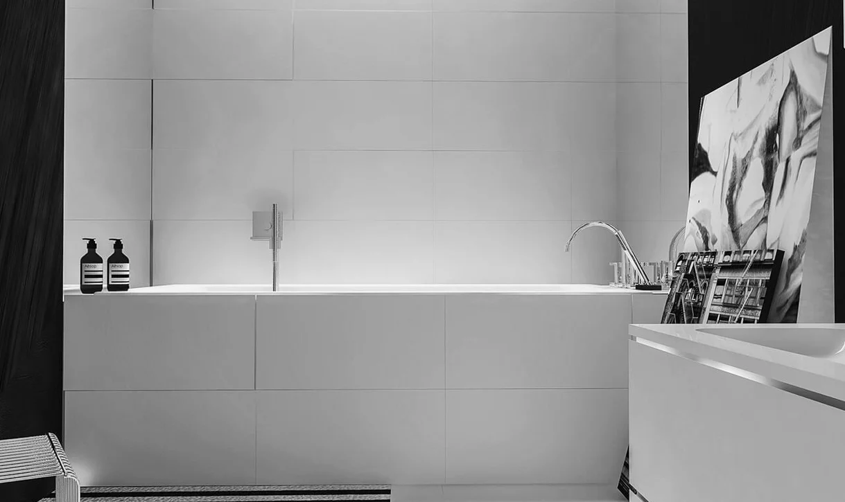 Biel i czerń w minimalistycznej łazience z wanną