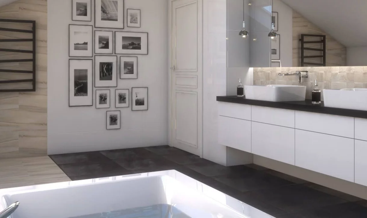 Jak nadać osobisty, niepowtarzalny charakter prywatnej łazience? Jedną ze ścian można wykorzystać jako galerię zdjęć z wspomnieniowych. Neutralne kamienne szarości i drewniana grafika płytek ceramicznych stanowią dobre tło do ekspozycji osobistych treści. Skosy poddasza, podkreślone symetrią lustrzanego odbicia, mogą być ozdobą łazienki.