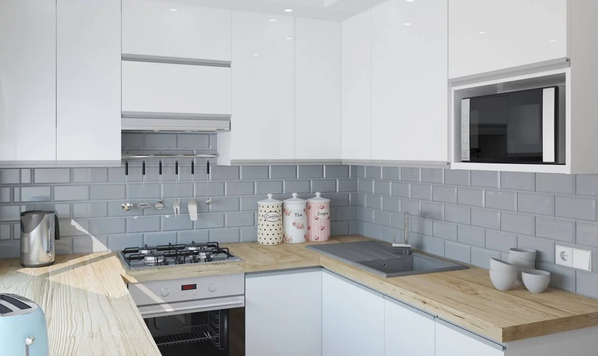 Szara cegła, biel i drewno w jasnej kuchni o kształcie litery U