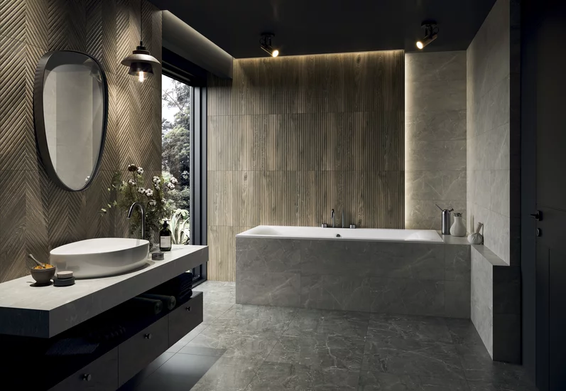 Odcienie szarości na ścianach można porównać do mgły, zza której wyłaniają się naturalne akcenty. Łazienka w drewnie i szarości to połączenie ciszy, łagodności i wyrazistych akcentów. Poczuj, jak imitacja drewna na płytkach ceramicznych dotyka Cię swoją autentycznością. To symfonia, która pozwoli Ci poczuć się w swojej łazience niczym w luksusowym SPA.