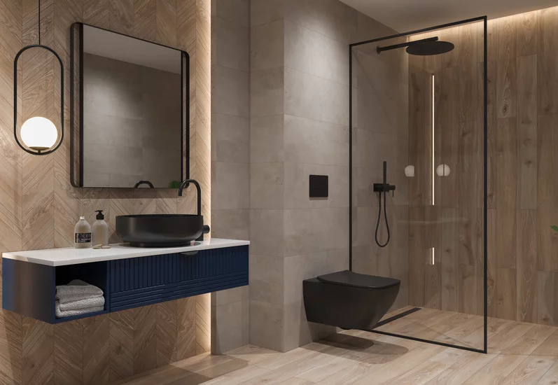 Szara łazienka z drewnem i czarnymi dodatkami – poznaj ciekawe pomysły