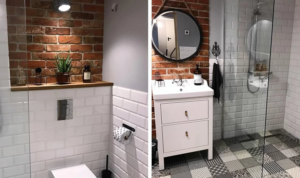 Styl retro we współczesnym wydaniu może przybrać formę ciekawych połączeń - na przykład dwóch rodzajów cegły (czerwonej i białej), wzorzystej podłogi i nowoczesnego oświetlenia. Oryginalne dodatki wzmacniają efekt aranżacyjny. Łazienka, choć nieduża, jest wygodna i efektowna.