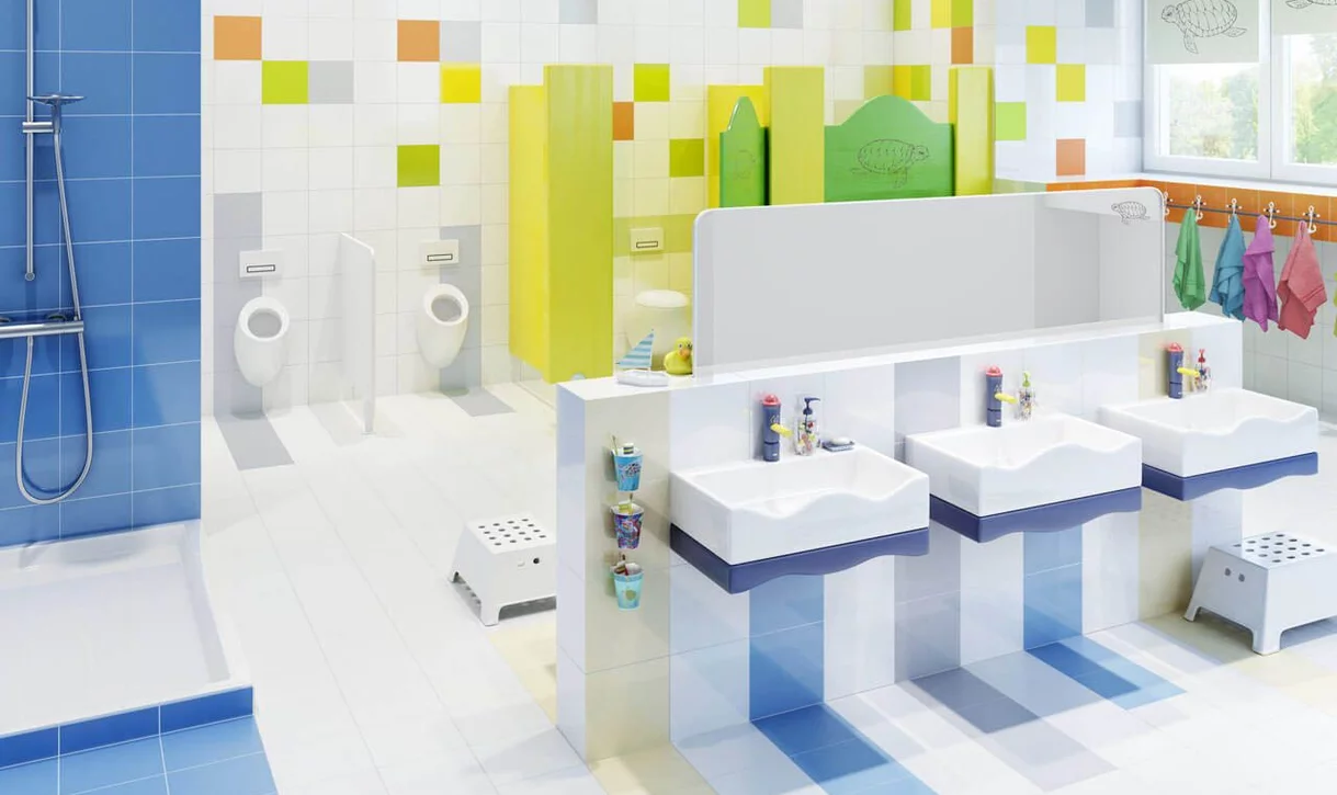 W przedszkolnej łazience zabawa jest punktem wyjścia dla projektowania przestrzeni. Musi być kolorowo i sympatycznie, a przy tym higienicznie i bezpiecznie. Dzięki kwadratowym płytkom Gamma / Gammo można wyczarować bajkowe miejsca, które dzieci pokochają.