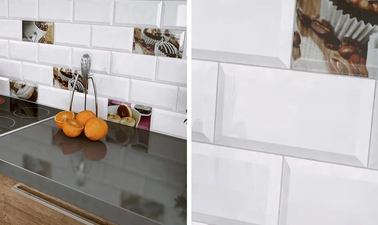 Tradycyjna kuchnia z białymi płytkami i kawowymi dekoracjami