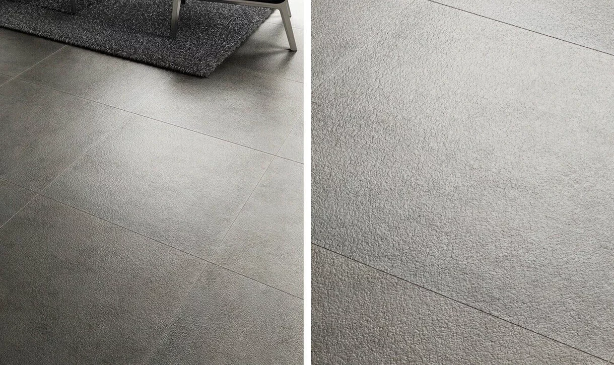 Szara podłoga stanowi jednolitą płaszczyznę dzięki rektyfikowanym krawędziom i wąskim fugom. Lekko połyskująca powierzchnia płytek podłogowych wnosi elegancję do nowoczesnego salonu.