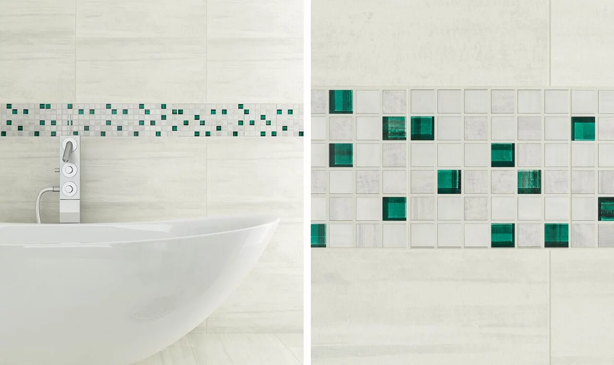 Jasnoszare matowe płytki bazowe są doskonałym, neutralnym tłem dla pięknych szklanych dekoracji w morskich barwach. Dzięki nim łazienka pulsuje życiodajną energią. Konsekwentne stosowanie przeźroczystych elementów wystroju nasyca pomieszczenie światłem.