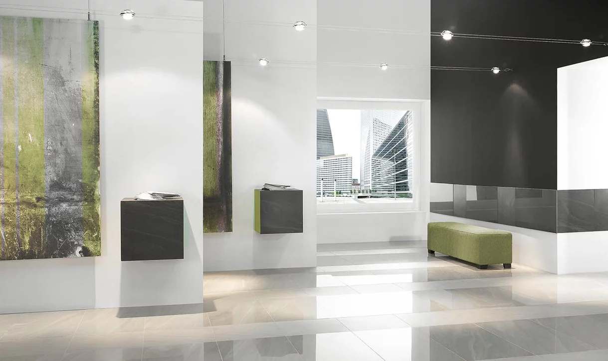 Nowoczesna ekspozycja dzieł sztuki wymaga eleganckiej, a jednocześnie dyskretnej oprawy. Neutralne barwy wielkoformatowych płytek podłogowych są idealnym tłem dla prezentowanych prac. Pasy polerowanej powierzchni dodają blasku ekspozycji, zaś węższe matowe fragmenty podłogi urozmaicają płaszczyznę o jednolitej kolorystyce.