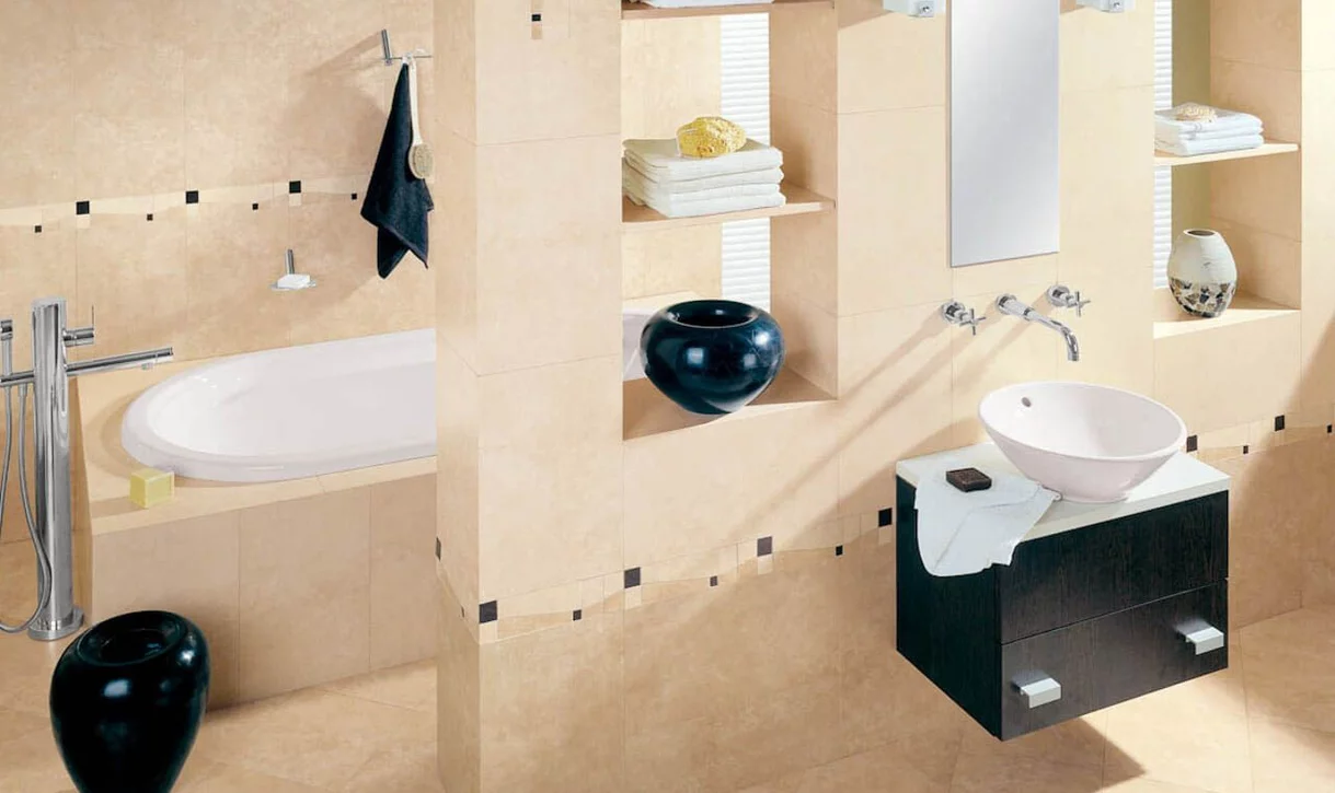Klasyczna łazienka w barwach jasnego beżu ma oddzieloną strefę z wanną. Poziome pasy dekoracji z falistą linią i mozaikowymi czarnymi wstawkami, urozmaicają jednolitość ściennych płaszczyzn. Dzięki czarnym dodatkom łazienka nabiera charakteru.