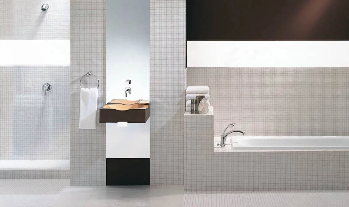 Minimalistyczna biało-czarna łazienka z mozaiką w roli głównej