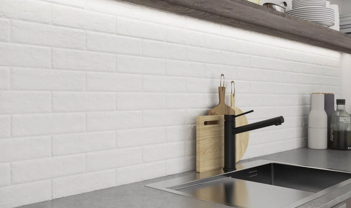 Matowe płytki o wyglądzie białych cegieł, ułożonych w tradycyjny sposób, mają nieregularną, strukturę. W połączeniu z drewnem półki i modnym wyposażeniem, robią wrażenie solidnego, spokojnego miejsca.