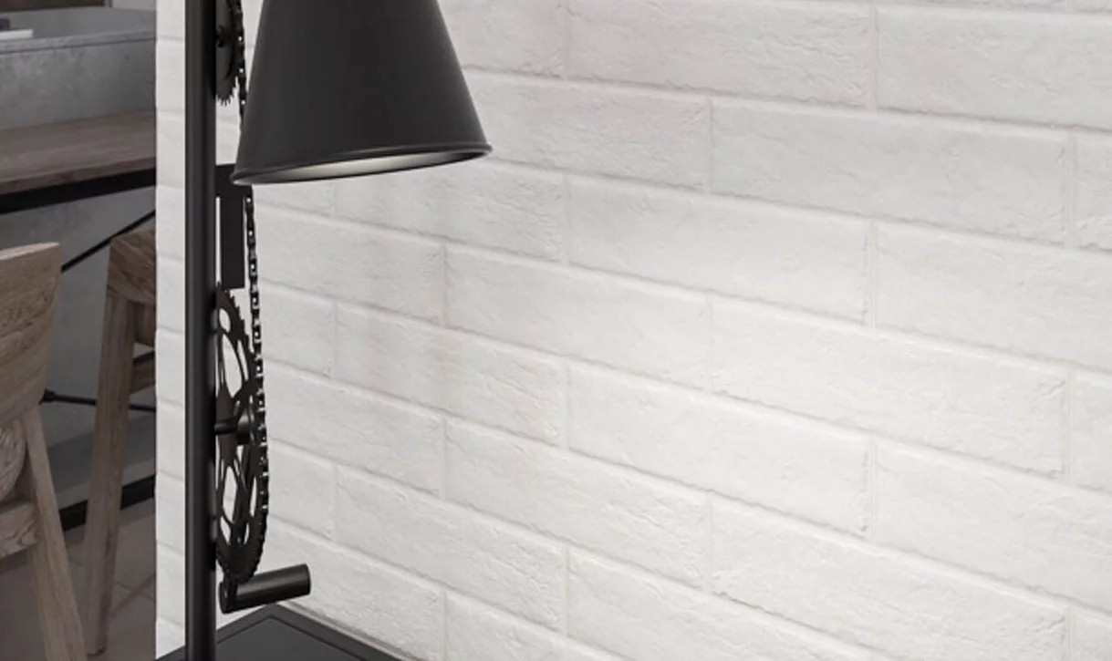 Klinkierowe płytki o wyglądzie matowej białej cegły, w industrialnej kuchni oświetlone są oryginalną metalową lampą. Cegła, metal i oszczędność to cechy charakterystyczne stylu loftowego.