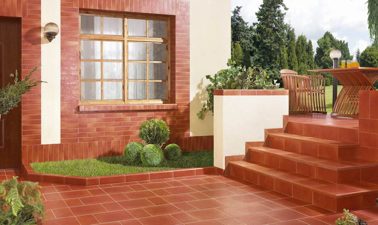 Płytki klinkierowe Taurus Rosa w kolorze ciepłej, czerwonej cegły, zdobią elewację, schody, taras i strefę wejściową tradycyjnego domu. Wąskie cegiełki elewacyjne, w połączeniu z kwadratowymi i prostokątnymi płytkami podłogowymi oraz stopnicami, tworzą śródziemnomorski klimat.