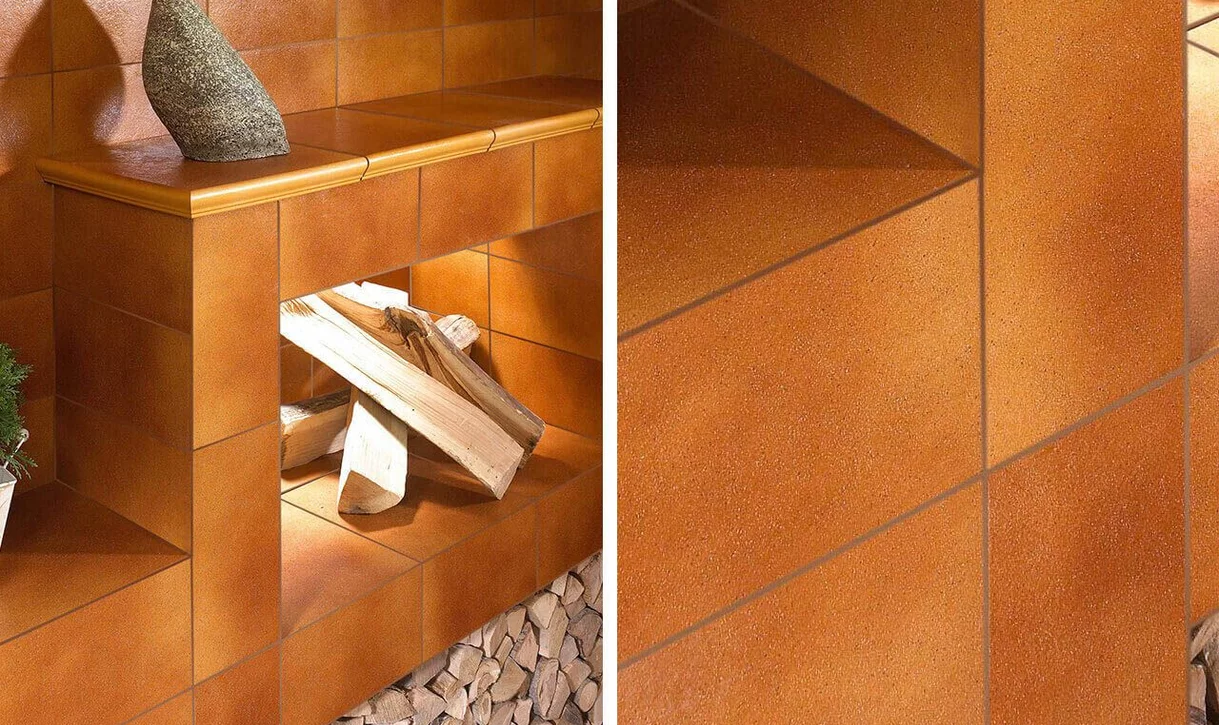 Nawet na tarasie może być jak w przytulnym salonie – i tu może się znaleźć kominek z ozdobną obudową w charakterze półki. Ciepła barwa płytek klinkierowych podkreśla atmosferę miejsca.