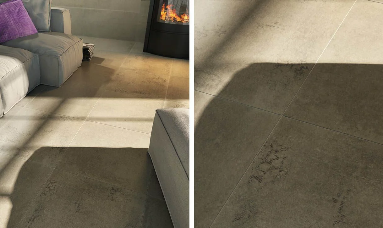 Szklane schody i metalowy kominek to silne akcenty w jasnoszarym, nowoczesnym wnętrzu. Neutralnym tłem dla nich są bardzo eleganckie, wielkoformatowe płytki. Ściany wyłożone są bardzo dużymi szarymi prostokątami, a podłogi ceramicznymi kwadratami.