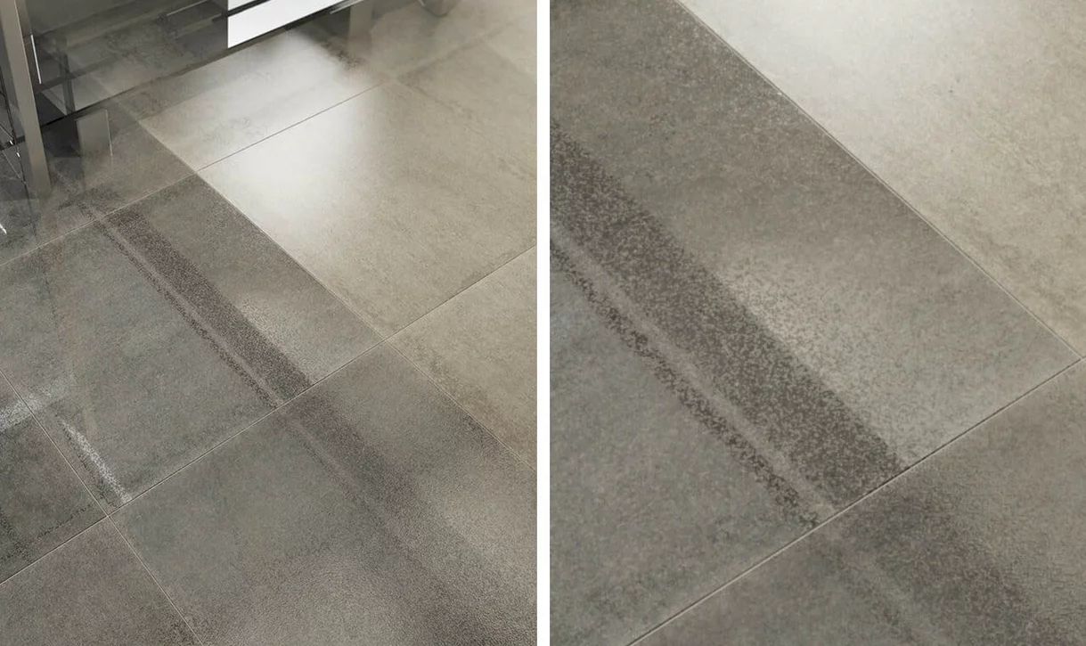 Lekko lśniąca, półpolerowana powierzchnia płytek ceramicznych, potęguje efekt rozświetlenia wnętrza ze szklanymi schodami. Szarość wielkoformatowych płytek wpisuje się w nowoczesne trendy projektowania wnętrz.