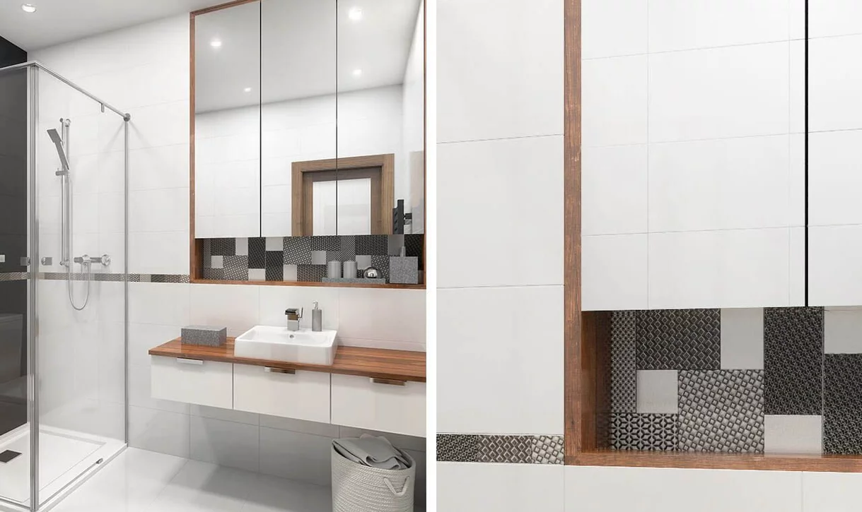 Szara przeplatanka w kształcie kwadratowej mozaiki adekwatnie wpisuje się w przestrzeń pod lustrem, podkreślając jednocześnie styl całej aranżacji. Subtelna linia okalająca pomieszczenie nadaje mu zgrabny kształt i nawiązuje do szarej mozaiki.