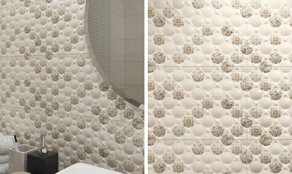 Motyw modnej mozaiki z przeplatającym się układem wklęsłych kół dekoruje rodzinną łazienkę w subtelny sposób i znakomicie współgra z jasnymi płytkami naściennymi Enrica.